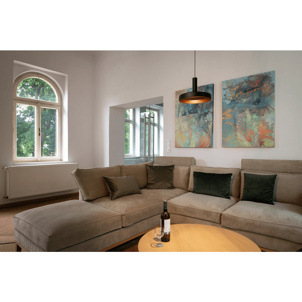 The LED 1-phase pendant light LALU® SET TETRA 24 impresses with its slender, cylindrical design and high-quality materials such as aluminum and steel. With a diameter of 24 cm and a height of 16.5 cm, the light stylishly integrates into various lighting concepts. The combination of a matte black housing and a bronze-colored reflector creates a modern yet warm appearance that visually enhances any room.