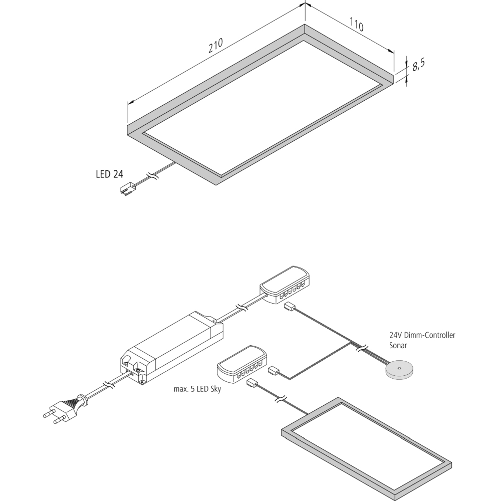 2pc. set of LED under-cabinet luminaire LED SKY 6W + LED transformer LED 24 / 30W, 3000K, black