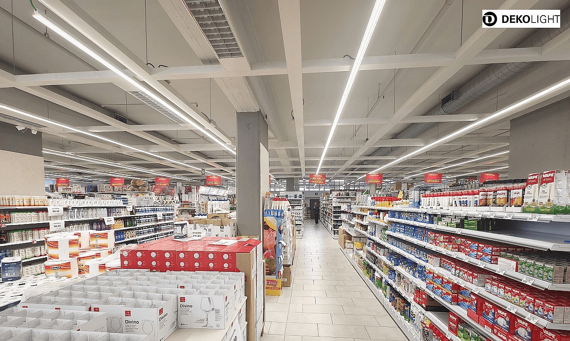 Thanks to the SMD LED 2835 light sources with a total of 192 LEDs, the LINEAR PRO 120 CCT produces uniform, symmetrical lighting on both sides of the aisle across the entire shelf height. The diffuse light distribution in the center ensures even illumination of the corridor itself. With a color rendering index of over 90Ra, the luminaire provides excellent color rendering for optimal presentation of goods.
