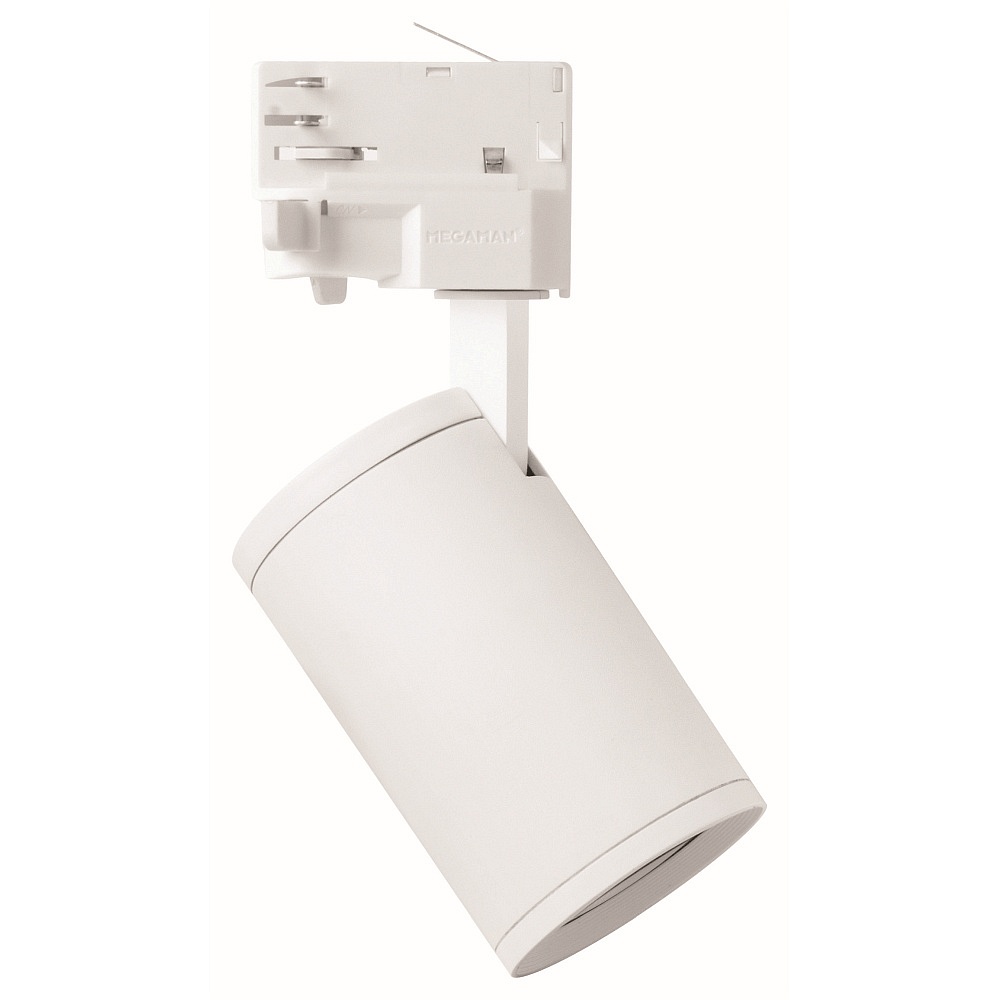The 3-Phase Spotlight MORA from Megaman is a lightweight track spotlight suitable for indoor use. It features a white plastic surface and has a round shape. With a diameter of 6 cm and a total height of 14.4 cm, it is compact and discreet in ceiling mounting.