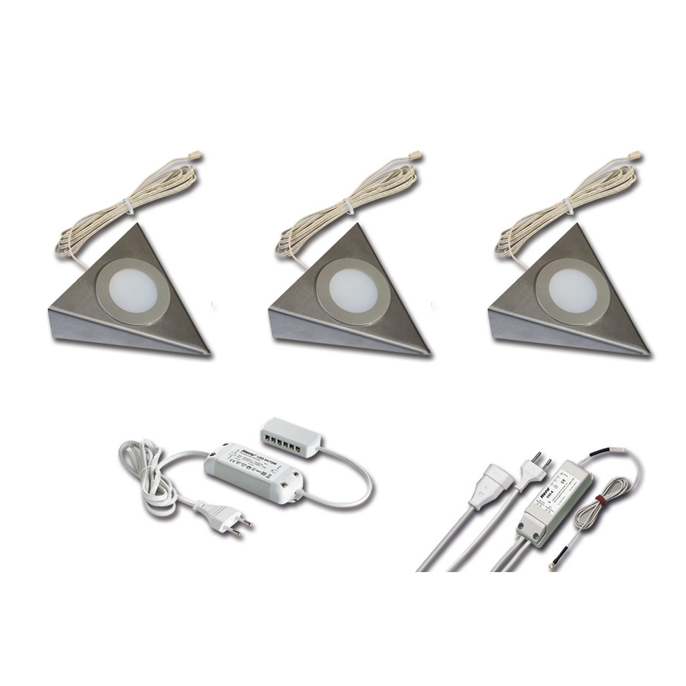 3pc. set of LED triangular under-cabinet luminaire UL 2-LED F, with EBS 4 switch + transformer LED 24 / 15W, inox, 3W 3000K