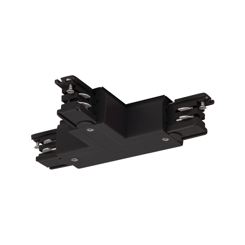 The T-connector from SLV is a specially designed accessory for the 3-phase track system S-TRACK ON/OFF. This high-quality product is used for the simple and secure connection of two tracks at a 90° angle. With its black color and robust polycarbonate housing, the connector integrates seamlessly into modern track systems. Protection class 1 and IP20 rating ensure reliable and safe use within the track system.