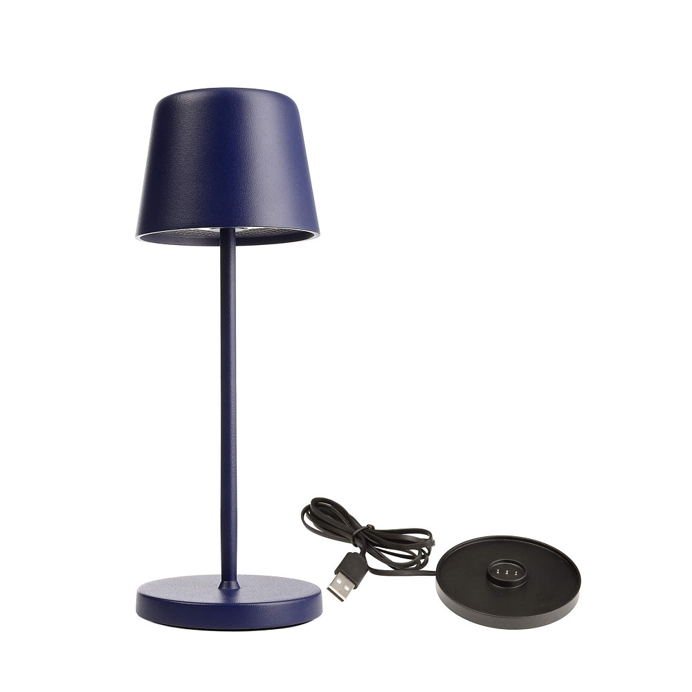 The table lamp comes with a 3.7V lithium-ion battery that provides a lighting duration of over 8 hours per charge. The battery charging time is approximately 4.5 hours. The contact charging station with USB-A plug allows for easy recharging of the lamp.
