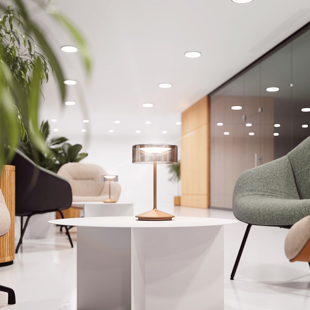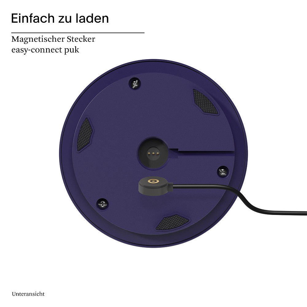The battery-powered table lamp has a built-in Li-Ion battery with a runtime of up to 12 hours at full power. The magnetic Easy-Connect charging system allows for easy charging within 5 to 7 hours. A charger and the appropriate charging cable are included.