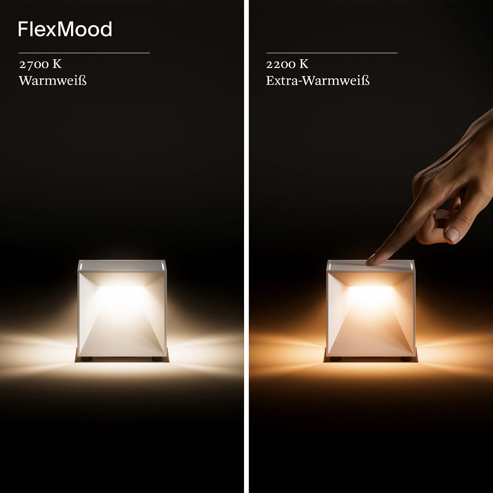 The NUTALIS MINI table lamp has a color temperature ranging from 2200 to 2700K, allowing for a pleasant and flexible lighting design. With the Flex-Mood feature, you can adjust the light color according to your mood and surroundings. The color rendering index of over 85Ra also ensures natural and vibrant colors.