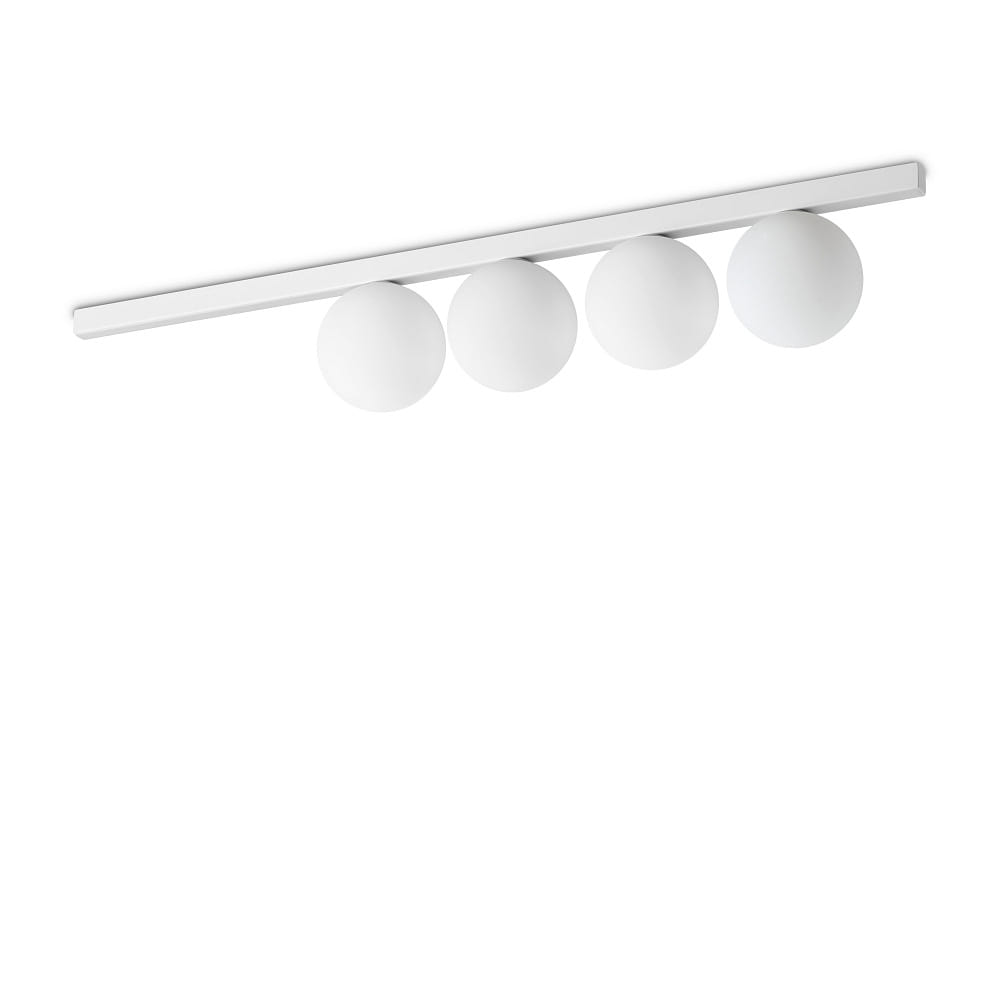 The BINOMIO ceiling light, with four flames, combines modern design with high functionality. With its white metal frame and the light diffuser made of blown, white, acid-etched glass, it harmoniously fits into various living styles. The combination of glass and metal ensures a high-quality appearance and a durable construction. The dimensions of 86 cm length, 12 cm width, and 15 cm height make this light a stylish eye-catcher on your ceiling.