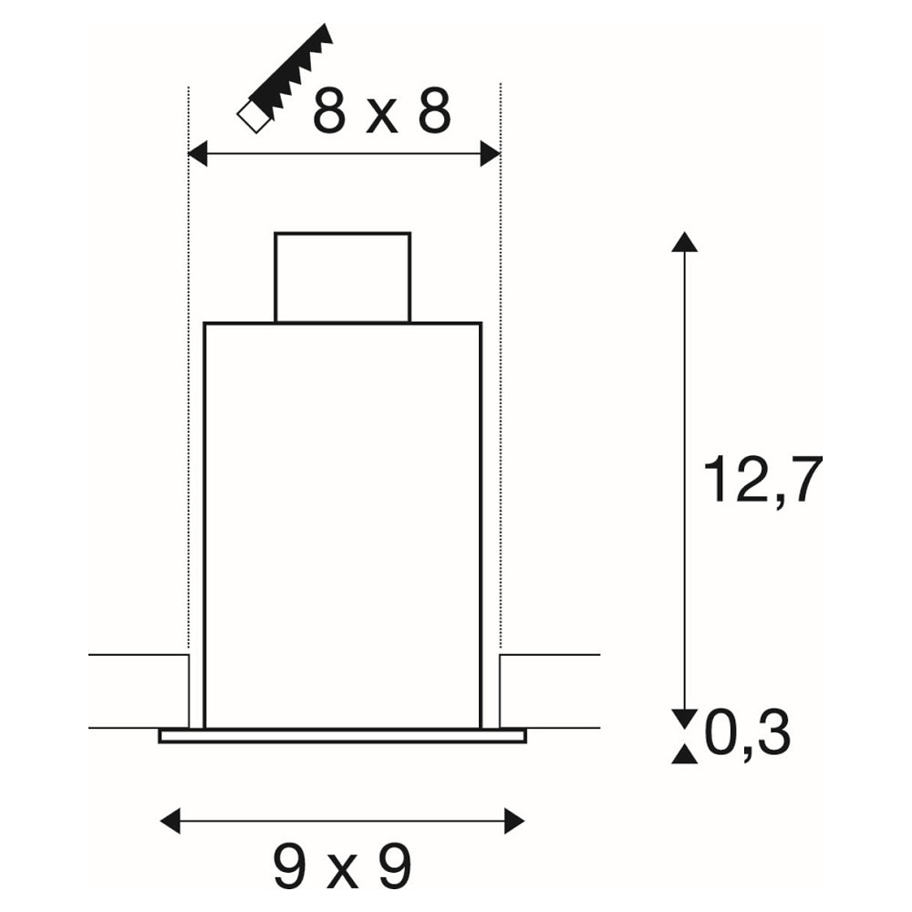 The installation depth of the spotlight is 13cm, with a rectangular installation opening measuring 8cm in length and width. The light head is adjustable, allowing for individual light alignment. The base designation of the light source is GU10, and LED light sources are available as an option.
