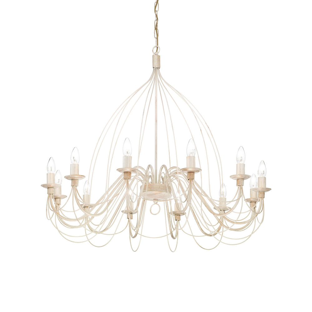 The chandelier CORTE SP12 is an elegant lighting element with 12 E14 sockets. With an operating voltage of 220-240V~, it can be installed on various ceilings. Its antique white color and metal material give it a classic and timeless design.
