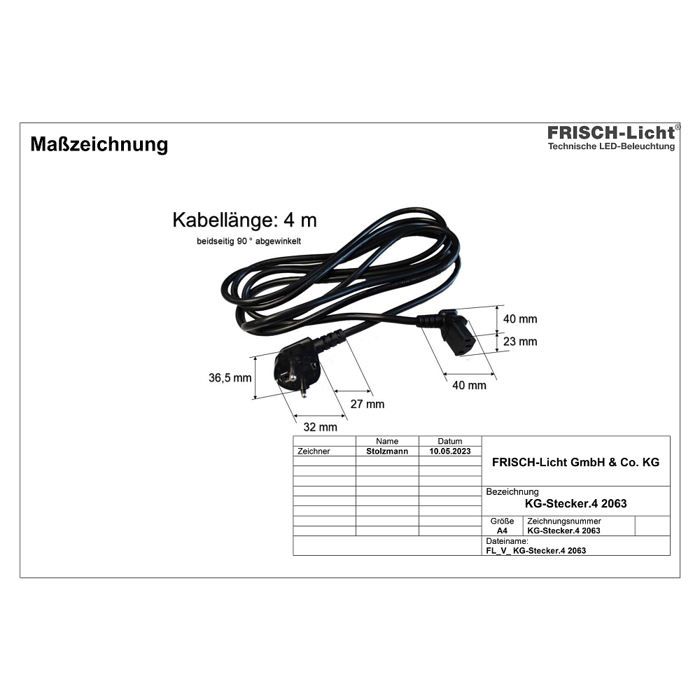 The optional cold device connection cable with the article number FL-KG-Stecker.42063 is specially designed for use with LED Office floor lamps from FRISCH-Licht®. With a length of 400 cm, it offers ample room for flexible positioning of the lamp. The cable is in classic black and ensures a discreet and elegant integration into any environment.