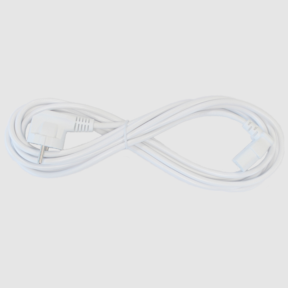 The connection cable operates with a voltage of 220-240 volts and a mains frequency of 50-60 Hz, which corresponds to common standards. It is equipped with a Schuko plug angled at 90°, as well as a secondary cold device connector, also angled at 90°. These angles ensure a space-saving and secure connection.