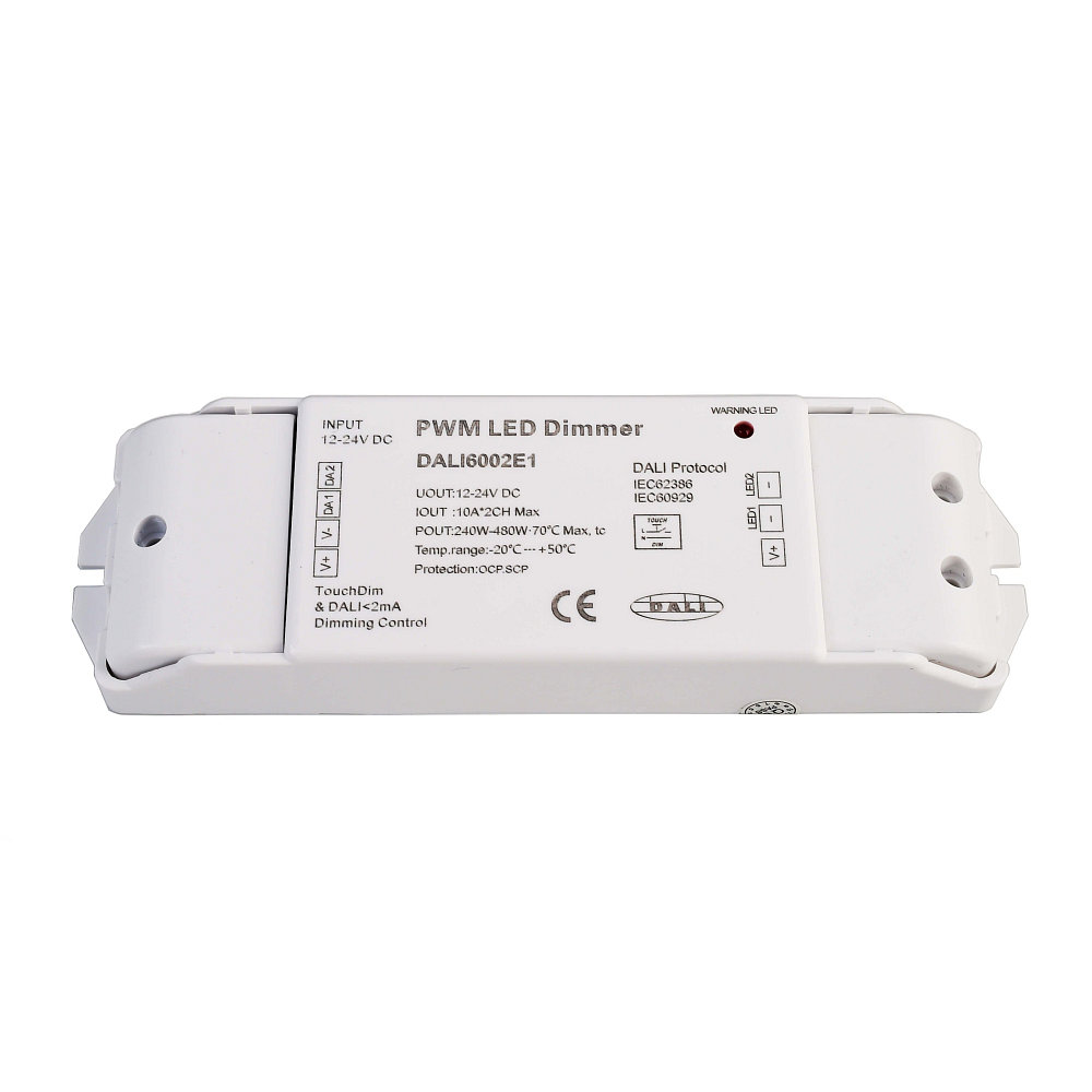 With dimensions of 16.7 x 5.1 x 2.3 cm and weighing only 0.097 kg, the DALI PWM Dimmer CV 2CH is space-saving and easy to install. The white plastic housing blends seamlessly into any environment and offers safe operation with protection class 3.