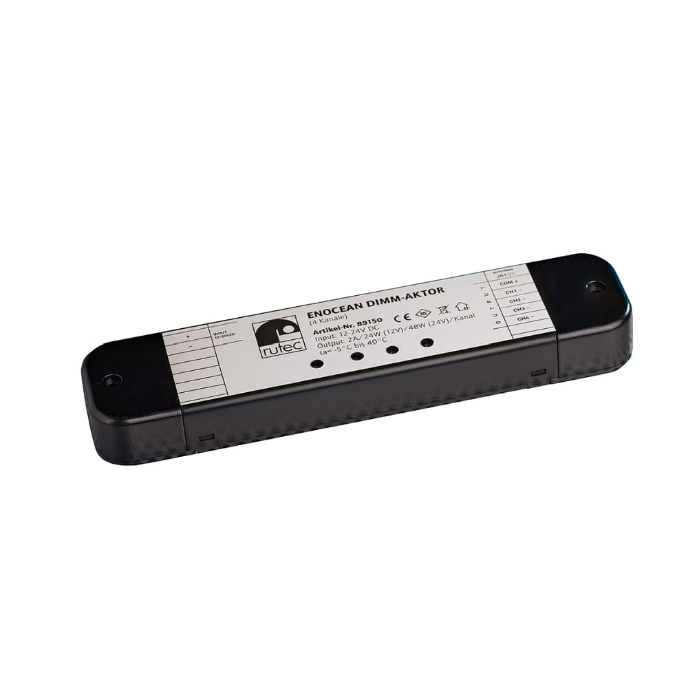The EnOcean Dimm-Actuator by Rutec Projekt is a powerful dimmer for 3- and 4-colored LED strips. With an operating voltage of 12-24V= and a maximum power of 96W (at 12V DC operation) or 192W (at 24V DC operation), it is ideal for various LED lighting applications.