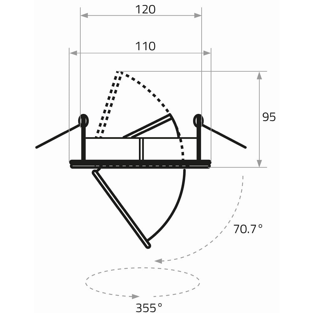 The size of the spotlight is Ø 12 x H 9.5 cm, the installation depth is 10 cm, and the installation opening has a circular diameter of 11 cm. The spotlight is equipped with a GU10 socket and can be operated with LED modules. The ambient temperature should be between 0 and +70°C.