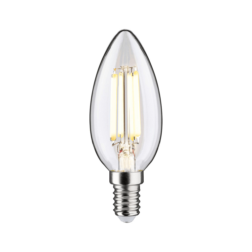 The LED filament candle-shaped ECO-LINE from Paulmann impresses with its exceptional energy efficiency and attractive design. With a power consumption of only 2.5 watts, this lamp delivers a luminous flux of 525 lumens, which corresponds to a conventional incandescent lamp with 43 watts. Thanks to the clear glass bulb and slim candle shape, it is not only functional but also highly decorative. The lamp features an E14 base and measures 3.5 cm in diameter with a length of 9.8 cm.
