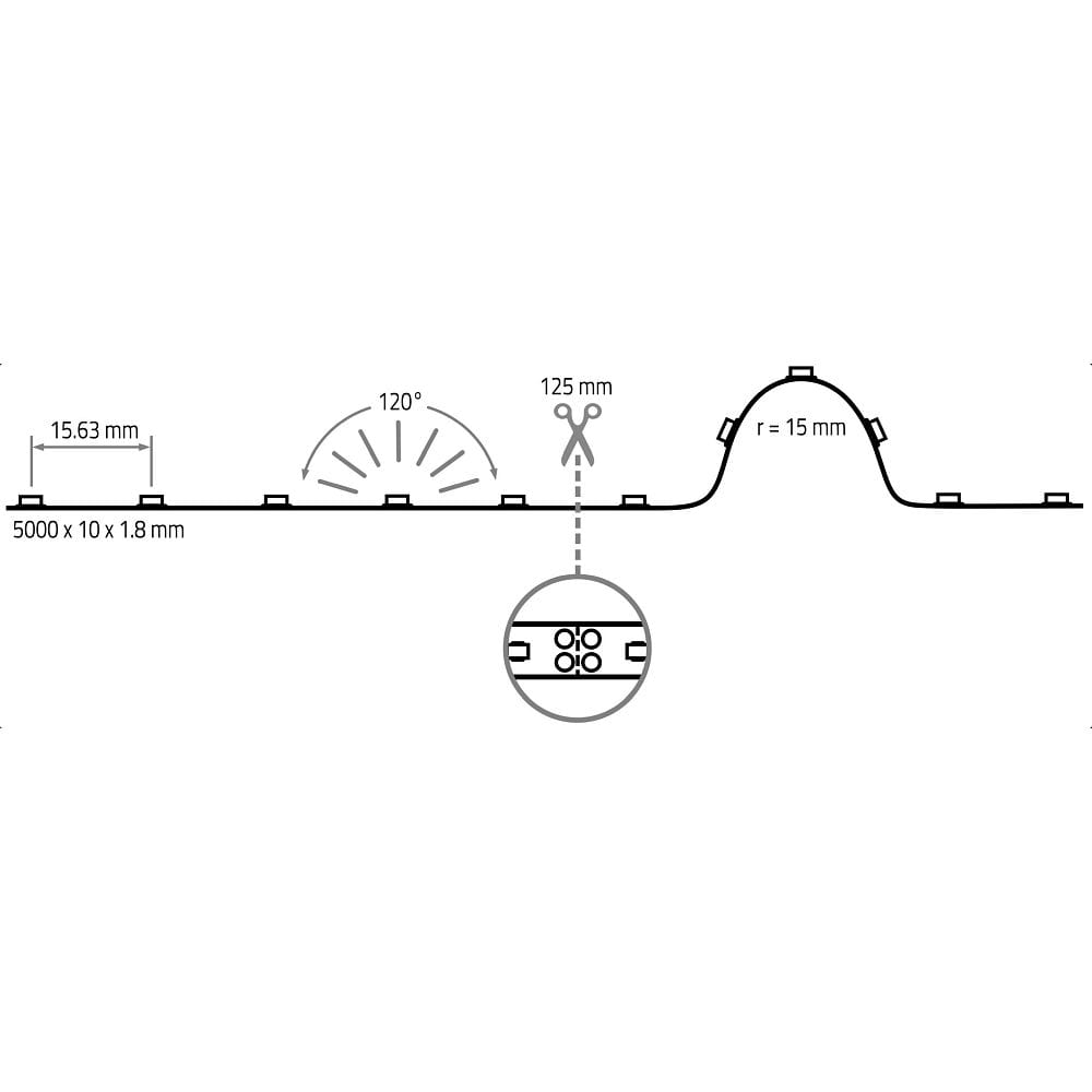 Thanks to its neutral white light color, the LED strip is ideal for use in various indoor areas. With a length of 500cm and a beam angle of 120°, it provides uniform illumination and creates a pleasant atmosphere.