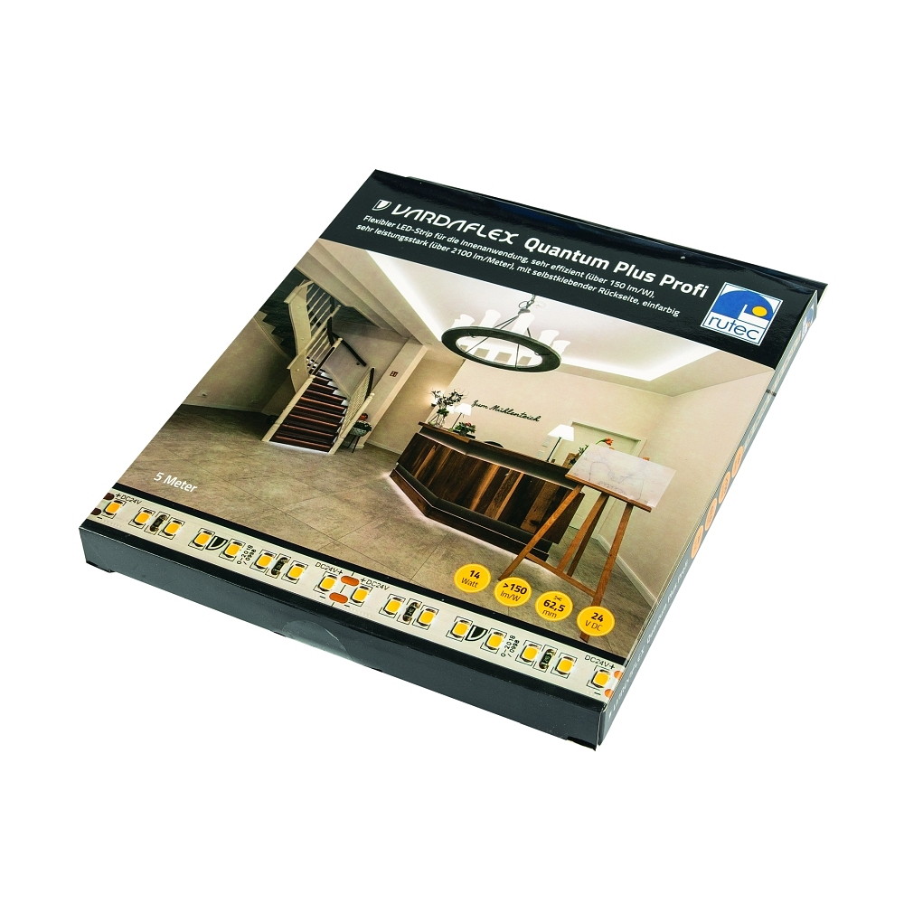 The sales box - LED Strip VARDAflex QUANTUM PLUS PROFI from Rutec is a high-quality product that impresses with a light output of 139.29lm/W and a luminous flux of 9750lm. With an energy efficiency class E and an energy consumption of 70kWh/1,000 h, this LED strip is not only powerful but also energy efficient.