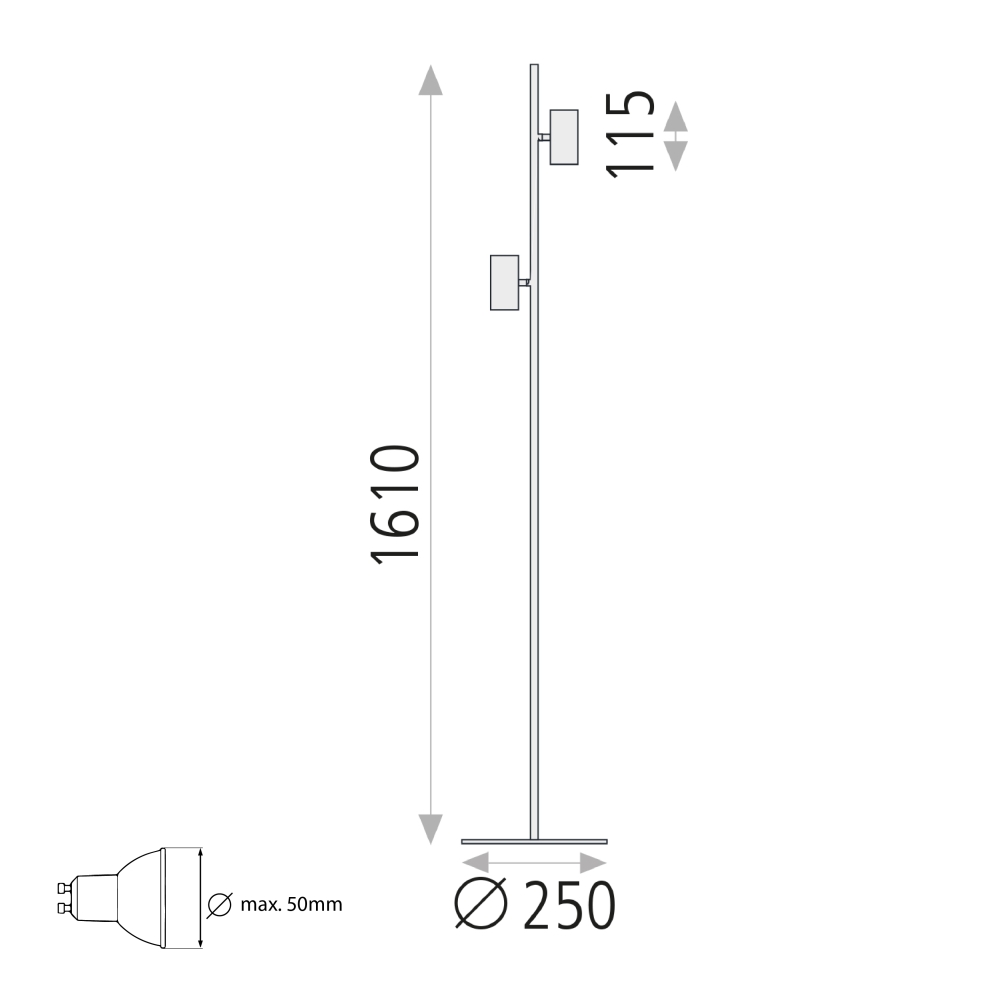 The floor lamp GINA is equipped with 2 x GU10 LED bulbs, each with a power of 8W. The operating voltage is 110-240V~, and the lamp is not dimmable. The swivel range is 350°, allowing you to adjust the light according to your needs. The color rendering index is >80Ra, ensuring natural color reproduction.