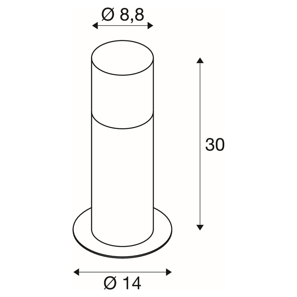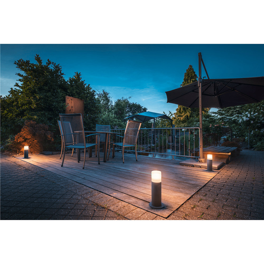 The GRAFIT floor lamp has an E27 socket, suitable for interchangeable bulb lamps. With a size of 14 cm in diameter and 30 cm in height, it fits perfectly in various outdoor areas. The lamp is IP44 splash-proof and can be directly connected to a 230V AC power supply.
