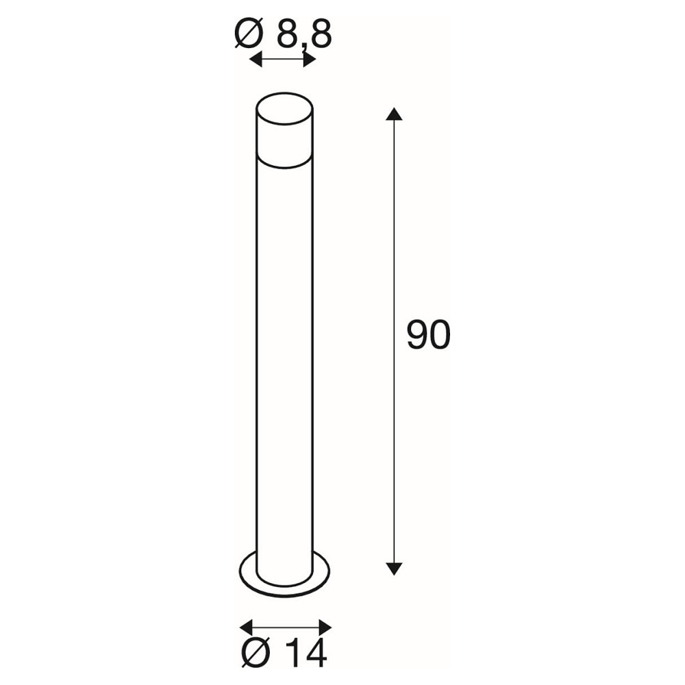 The lamp operates at a voltage of 220-240V~ and has an E27 socket for the light source. With a total Ø/H of 14/90 cm, a lamp body Ø of 8.8 cm, and a base plate Ø of 14 cm, it offers a compact size.