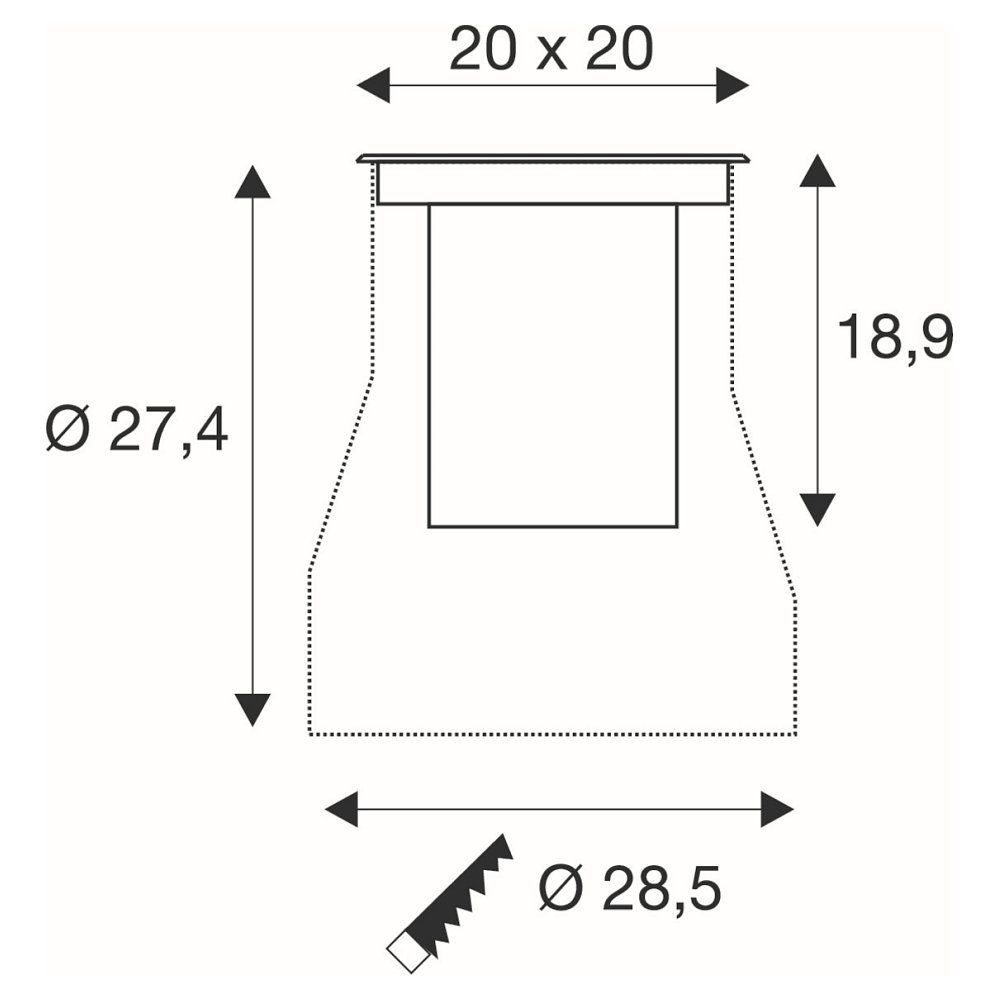 With an installation depth of 27.4 cm and an installation opening diameter of 28.5 cm, the luminaire fits into various recessed floor systems. The luminaire measures 20 x 20 x 18.9 cm (L x W x H) and weighs 3.6 kg. The connection cable is 105 cm long and suitable for cable diameters from 9 to 13.5 mm. The operating voltage is 220-240 V with a mains frequency of 50/60 Hz. The maximum surface temperature is 60 °C, and the color rendering index is over 80 Ra, ensuring natural color representation.