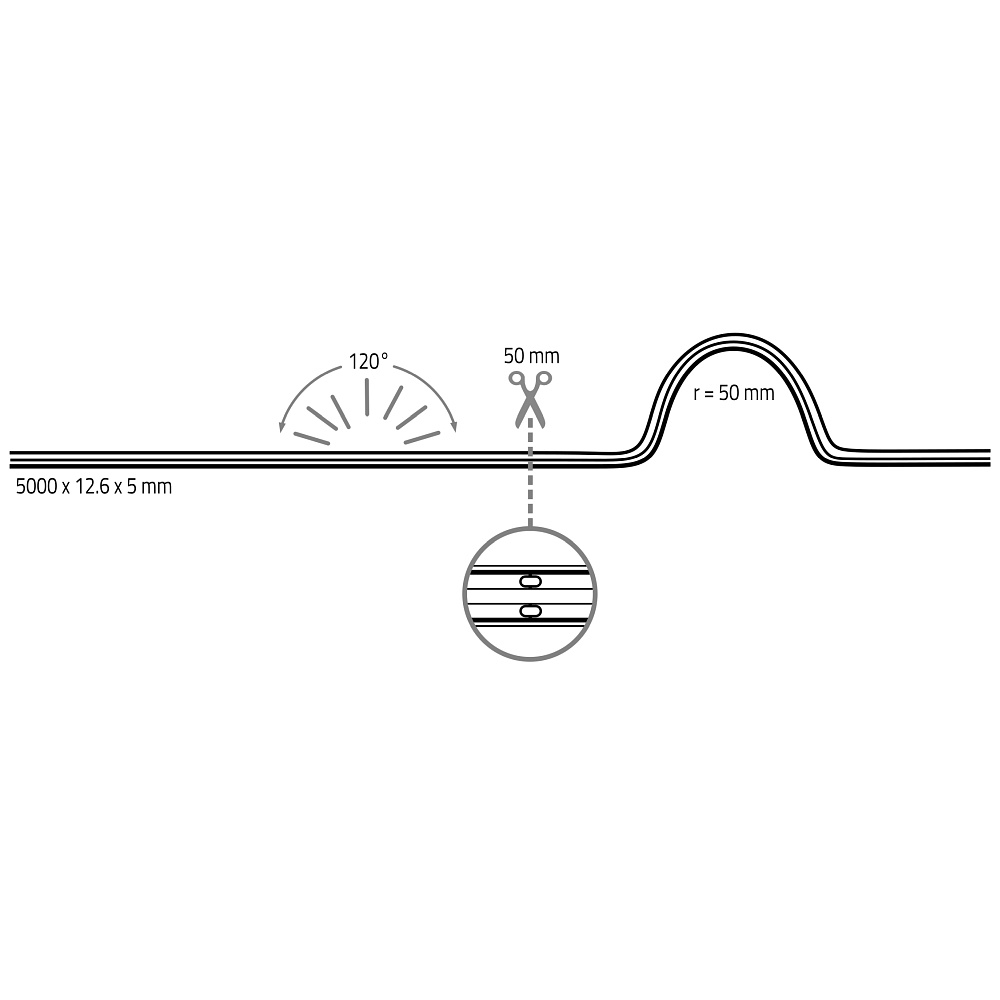 The fully silicone-coated LED strip has a size of 500cm length and 1.26cm width. Each individual section is 5cm long and the LED spacing is 0.21cm. The minimum bending radius is 10cm. With a total of 2400 light sources per meter and a color rendering grade of 1A, the LED strip offers excellent light quality. The IP protection class IP67 ensures safe use outdoors.