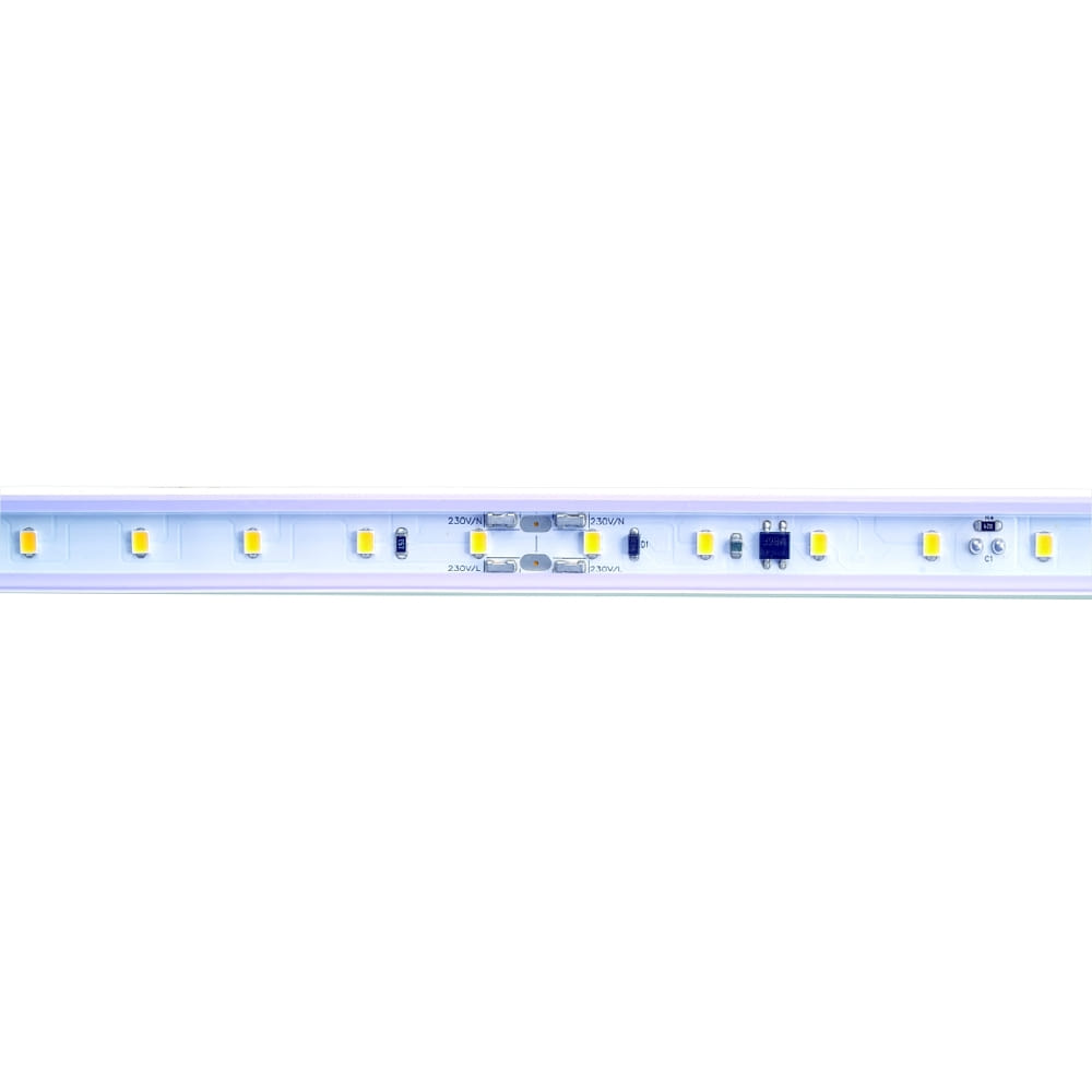 The LED strip comes with an open cable end and operates at a voltage of 230V AC. With a beam angle of 120° and a light output of 88.89lm/W, it offers uniform and bright lighting. The UV protection ensures a long lifespan for the LEDs.
