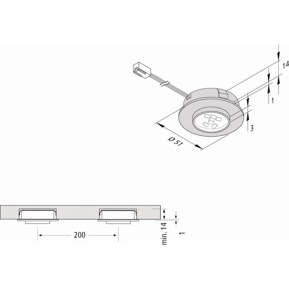 The furniture light impresses not only with its technical features but also with its modern design. The light is made of sturdy metal and has a total size of Ø 5.1 cm and a height of 1.8 cm. The visible part has a diameter of 5.1 cm and a height of 0.4 cm. The trim has a diameter of 5.1 cm and a height of 0.1 cm, while the ring has a height of 0.3 cm.