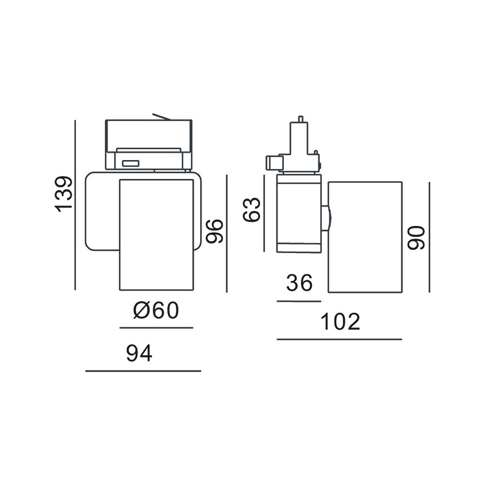 The luminaire has a diameter of 6cm, a length of 9.4cm, a width of 10.2cm, and a height of 13.9cm. It weighs 0.59kg and is in the color black. The material of the luminaire is aluminum and it has a protection class of 1 and an IP protection rating of IP20.