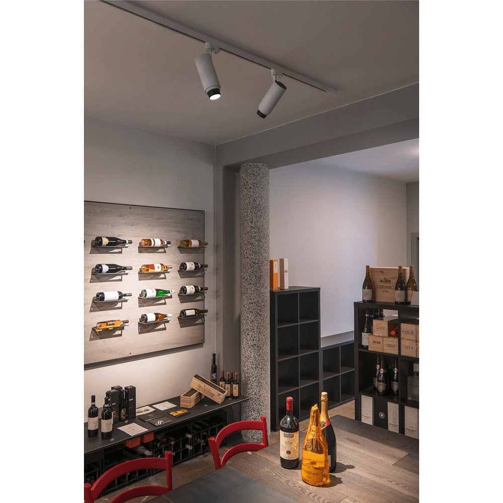 The spotlight comes with a 3-phase adapter and can be mounted in a track system. It is ideal for ceiling and wall mounting, providing direct light distribution. With its timeless design and neutral white light color, it fits various room concepts.
