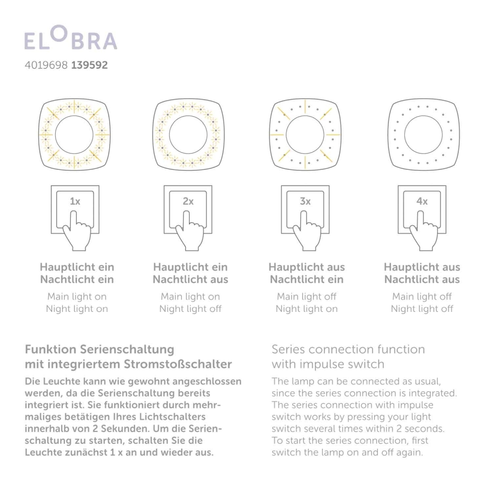 The required light source is included in the scope of delivery of the ceiling light. The brand Elobra stands for high-quality and durable lighting solutions. The item number ELO-139639 and the EAN 4019698139639 guarantee the quality and originality of the product.