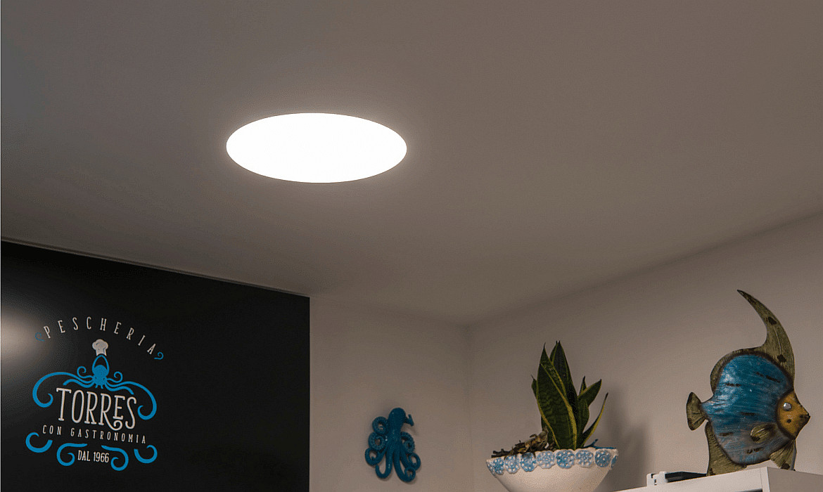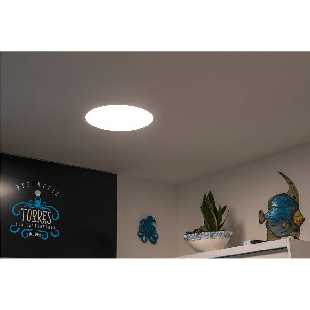 The LED Recessed Ceiling Light MEDO 60 EL is the frameless version with a cut-out diameter of 60.6 cm. With a power of 36W, a luminous flux of 5000lm, and a beam angle of 105°, it provides bright lighting in your space. The color temperature can be chosen between 3000K and 4000K to vary between warm white and neutral white light.