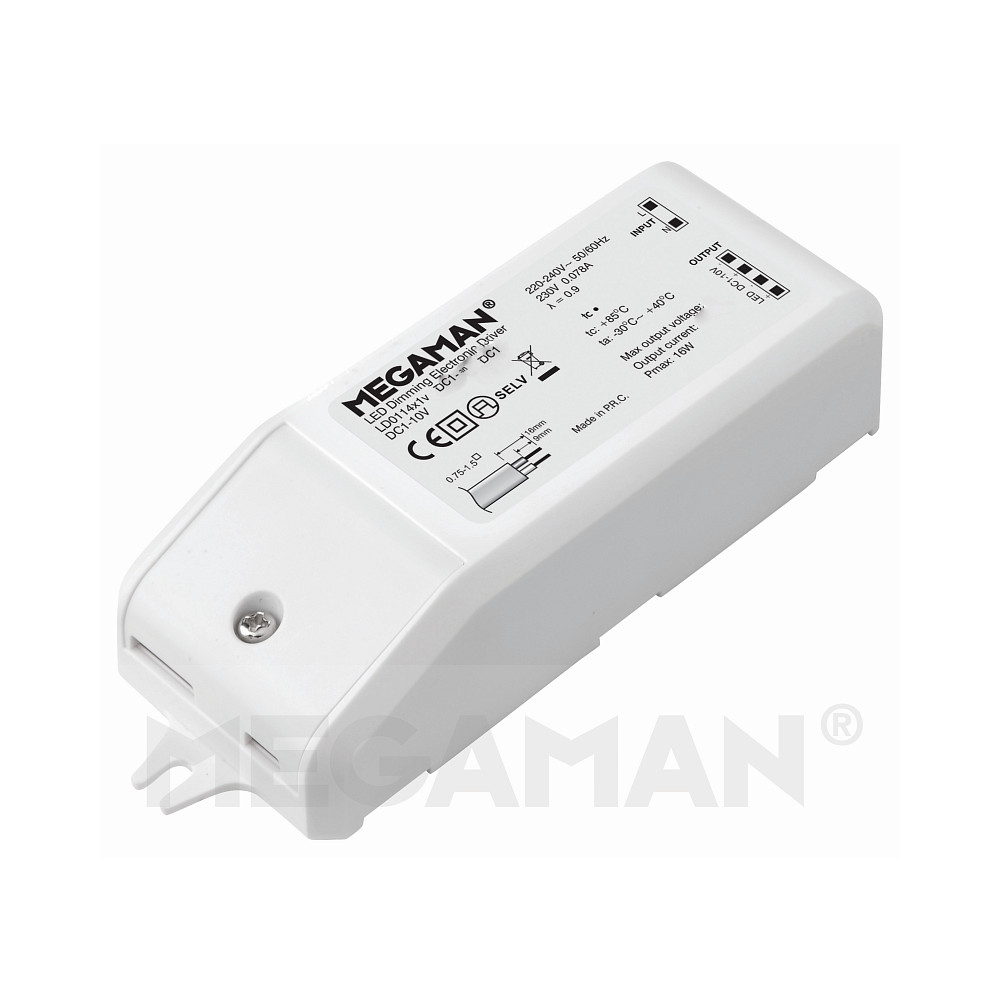 The LED driver from Megaman is perfect for operating low-voltage AR111 lamps. With a secondary voltage of 20V DC and a power of 10W at 500mA, it ensures reliable power supply.