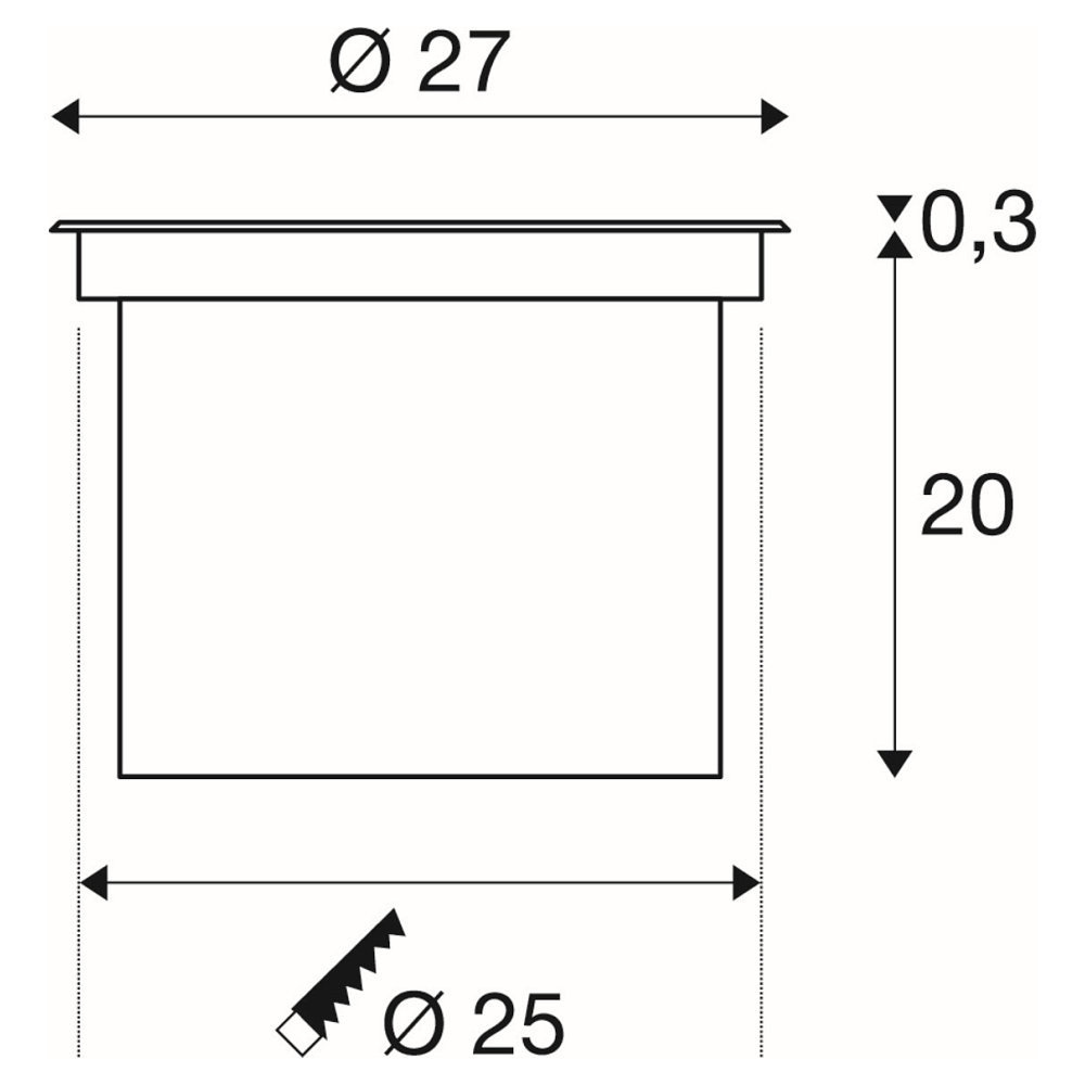 The installation depth of the recessed floor light is 19.9 cm and the installation opening has a diameter of 25 cm. The color temperature is 3000K and the color rendering index is 80Ra. The average lamp lifespan is 50000 hours. The light is suitable for outdoor use and can be installed in the ground.