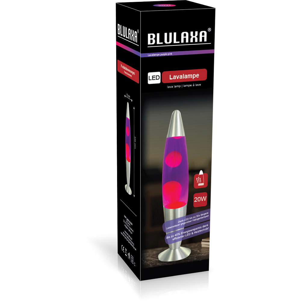Thanks to innovative LED and heating technology, the lava lamp consumes only 20 watts and enables energy savings of up to 40%. With an average lifespan of 30,000 hours, it is particularly durable. The lamp features a heating coil that serves as a heat source, setting the wax in motion and creating the typical lava lamp design. The warm-up time is at least one hour until the optimal light and movement experience is achieved.