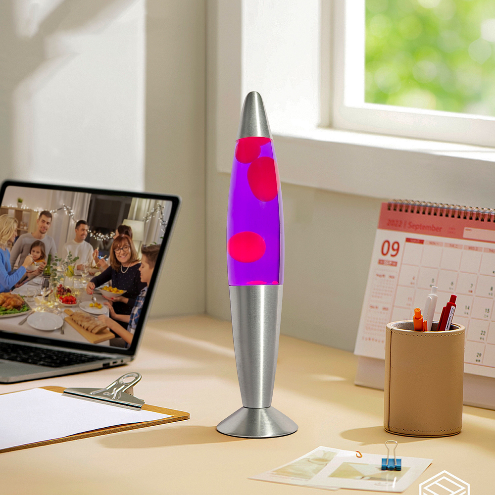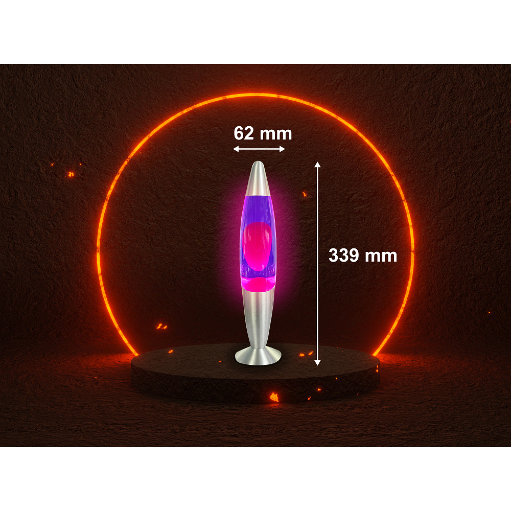 The combination of aluminum, glass, and plastic makes the LED Hybrid Lava Lamp robust and durable. The lamp base has a diameter of 8.9 cm, while the lamp body measures 6.2 cm. The high-quality craftsmanship is also evident in the polished sealed glass finish, which gives the product a noble look while providing protection. The pink and purple color scheme emphasizes the decorative character of the lamp.