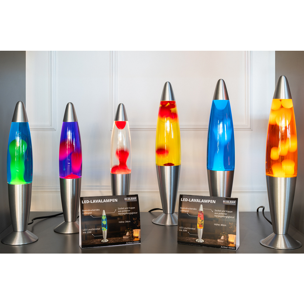 The Blulaxa LED Hybrid Lava Lamp is suitable as a table, decorative, or effect lamp and is available in various versions. In addition to the power cord, the package includes the switch, plug, and heating function, making setup straightforward. The lamp is designed for a mains voltage of 220-240V and a frequency of 50/60 Hz. This provides a modern solution for atmospheric lighting with a unique lava lamp effect.