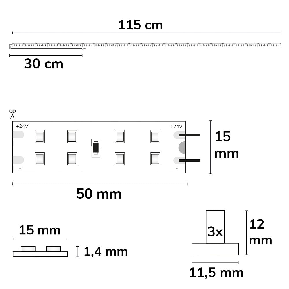 The retrofit board has a total of 184 LEDs and a length of 115cm. With a color rendering index of 80-89Ra, it ensures natural and realistic color representation. The operating voltage is 24V and the average lamp lifespan is 50000 hours. The installation is done by recessed mounting and the power connection is made via a MiniAMP flat plug.