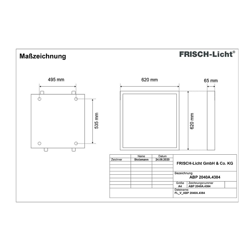 The square and flat LED surface-mounted panel from Frisch-Licht in white color is an energy-saving lighting solution for indoor use. With a power consumption of 34W and a luminous flux of 4300lm, it provides a bright and uniform illumination with a neutral white light color (4000K). The panel has a protection class of 1 and is suitable for both ceiling and wall mounting.