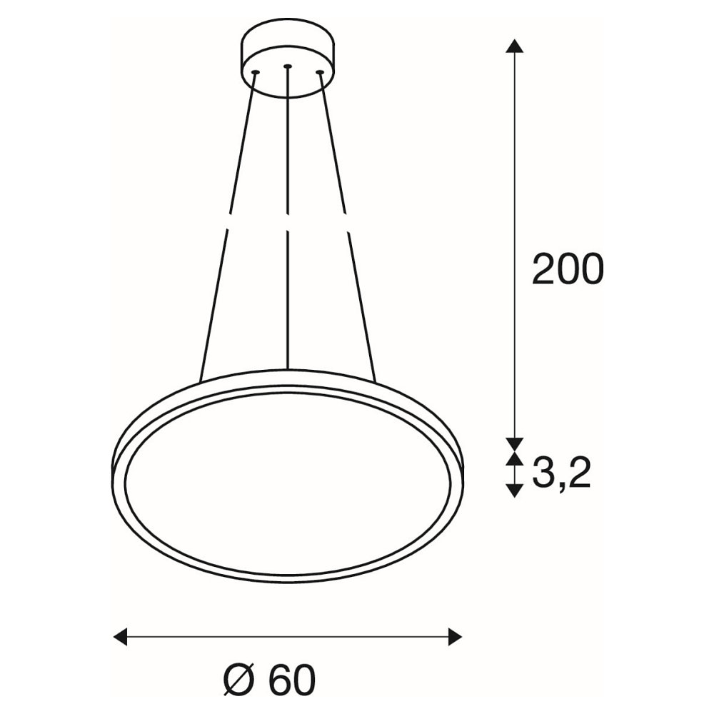 The pendant light has a size of Ø/H: 60/3.2 cm and is made of high-quality aluminum and polymethylmethacrylate (PMMA). It weighs 4.6kg and has an average lamp life of 30000 hours. The color temperature is 3000K and the color rendering index is 80Ra. Installation is done through surface mounting and the pendant length is adjustable up to 200cm.