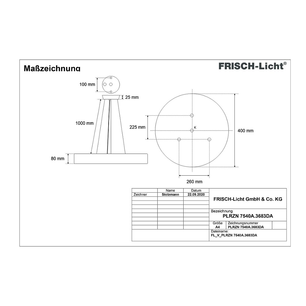 The round LED pendant light from Frisch-Licht offers direct and indirect light distribution and is ideal for use on indoor ceilings. With a size of Ø 40 cm and an operating voltage of 220-240V~, it provides pleasant lighting in living spaces or offices.