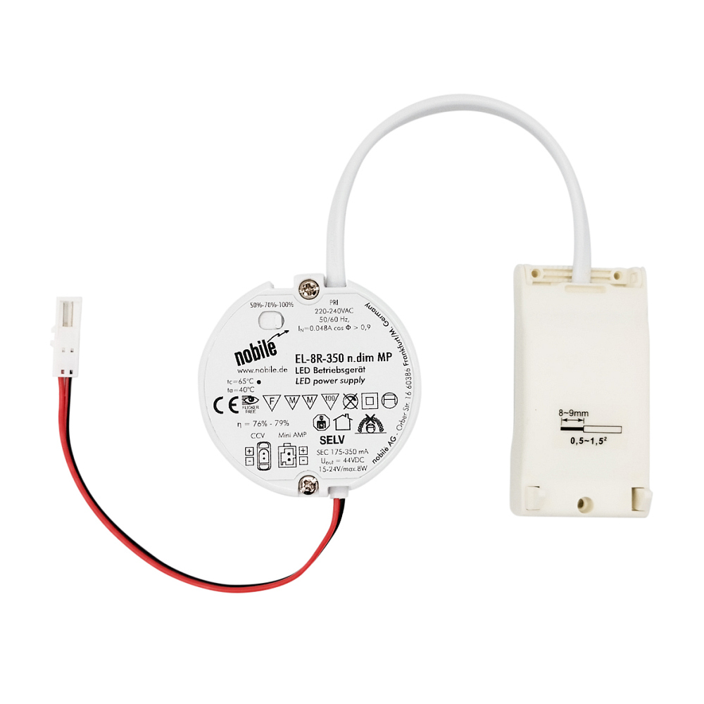 Thanks to the integrated switch, the LED round converter is easily dimmable and can thus be adapted to different lighting needs. Protection class 2 and protection rating IP20 guarantee safe operation at ambient temperatures from 0 to 40°C. Weighing only 95 grams, the device is easy to handle and, due to its static, switchable design, very versatile in use. Overall, the nobilé EL-8R-350 offers a modern and flexible solution for the control and supply of LED lighting systems.