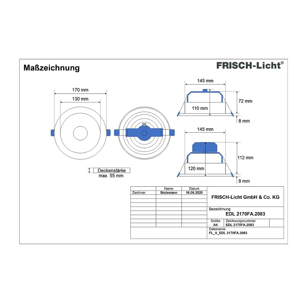 The LED recessed downlight from the brand Frisch-Licht impresses with its energy-efficient performance of 10 watts and a luminous flux of 1000 lumens. The fixture is round in design and features a faceted reflector that emits warm white light with a color temperature of 3000 Kelvin evenly and directly downward. With a luminous efficacy of 100 lm/W, the downlight provides bright and pleasant illumination specifically developed for demanding interior spaces.