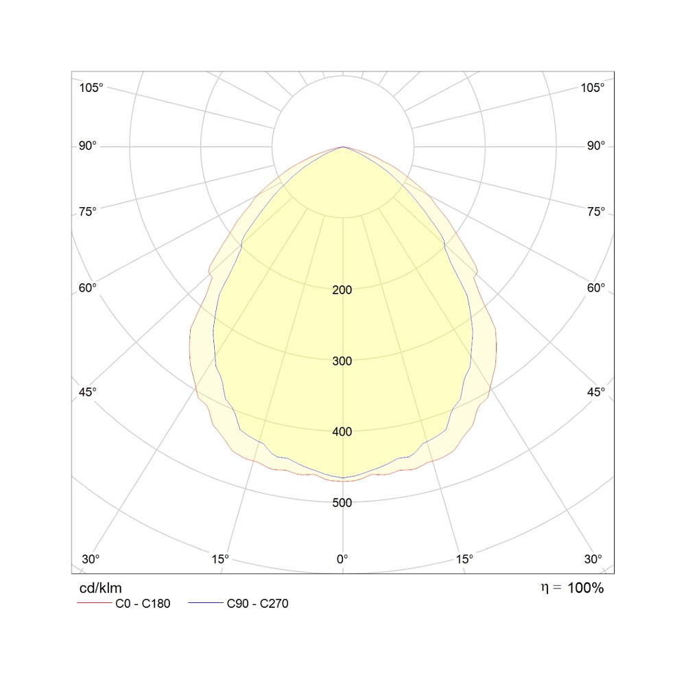 The light distribution is direct and symmetrical with a beam angle of 85°, enabling uniform and broad illumination. With an energy consumption of only 29 kWh per 1,000 operating hours, the downlight is particularly energy-efficient. Thanks to protection class IP21 and IK02, the fixture is robust against impacts and protected from dripping water, further supporting its durability.