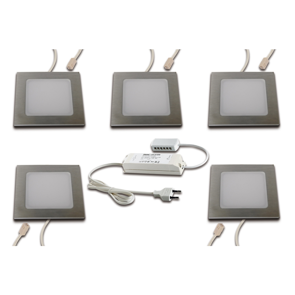 The 5-piece set of LED furniture recessed light FAQ 58 is ideal for illuminating furniture. The square lights have a diffuse light distribution and a color temperature of 4000K. With a color rendering index of over 93Ra, they provide optimal object lighting.