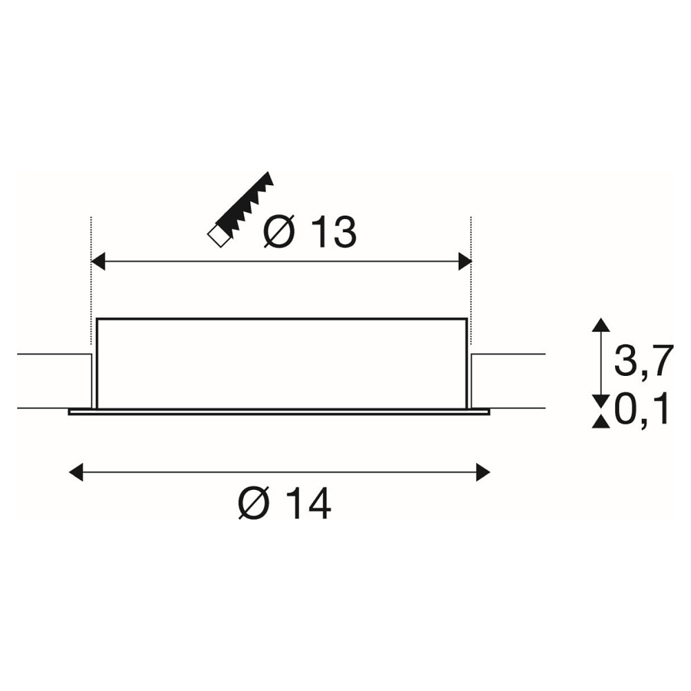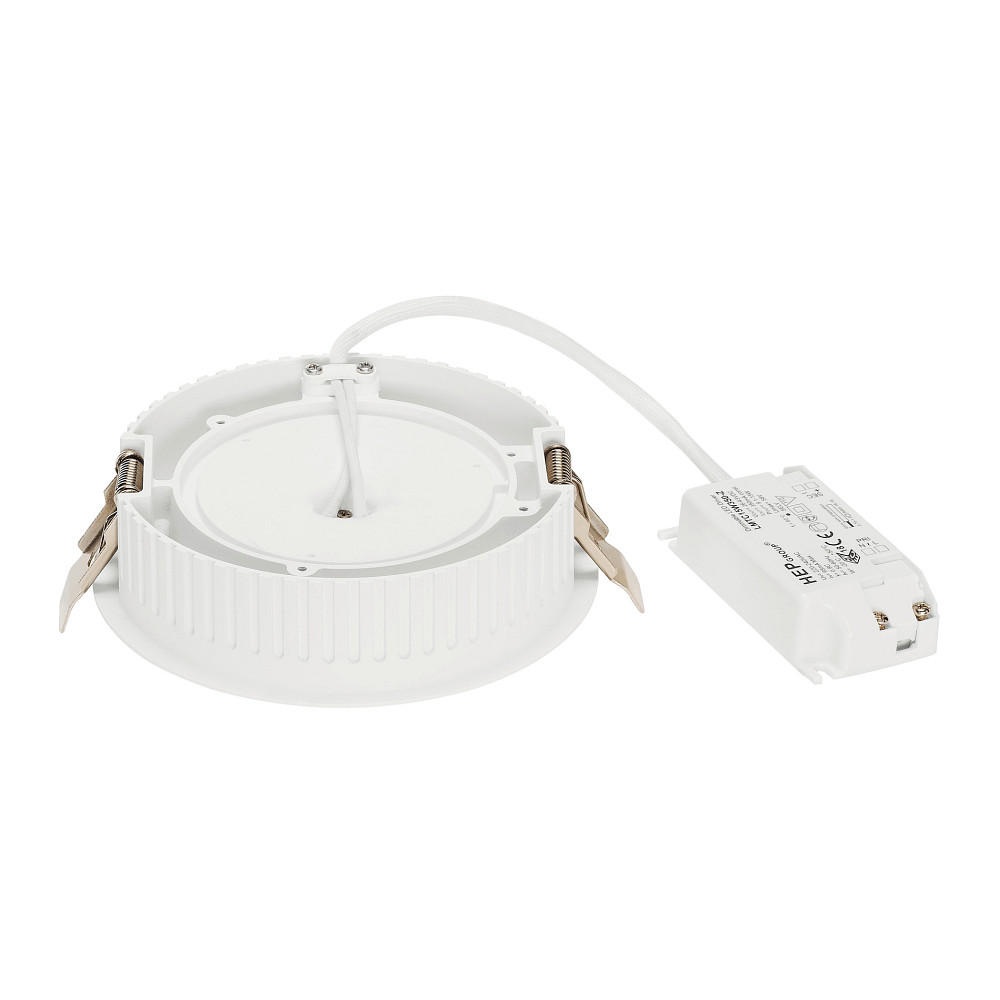 The recessed light has a total diameter of 14cm and a installation depth of 3.7cm. The visible part has a diameter of 14cm and a height of 0.1cm. The light has a beam angle of 120° and an IP protection rating of IP20. It comes with a driver and clip springs and can be dimmed with a phase-cut dimmer.