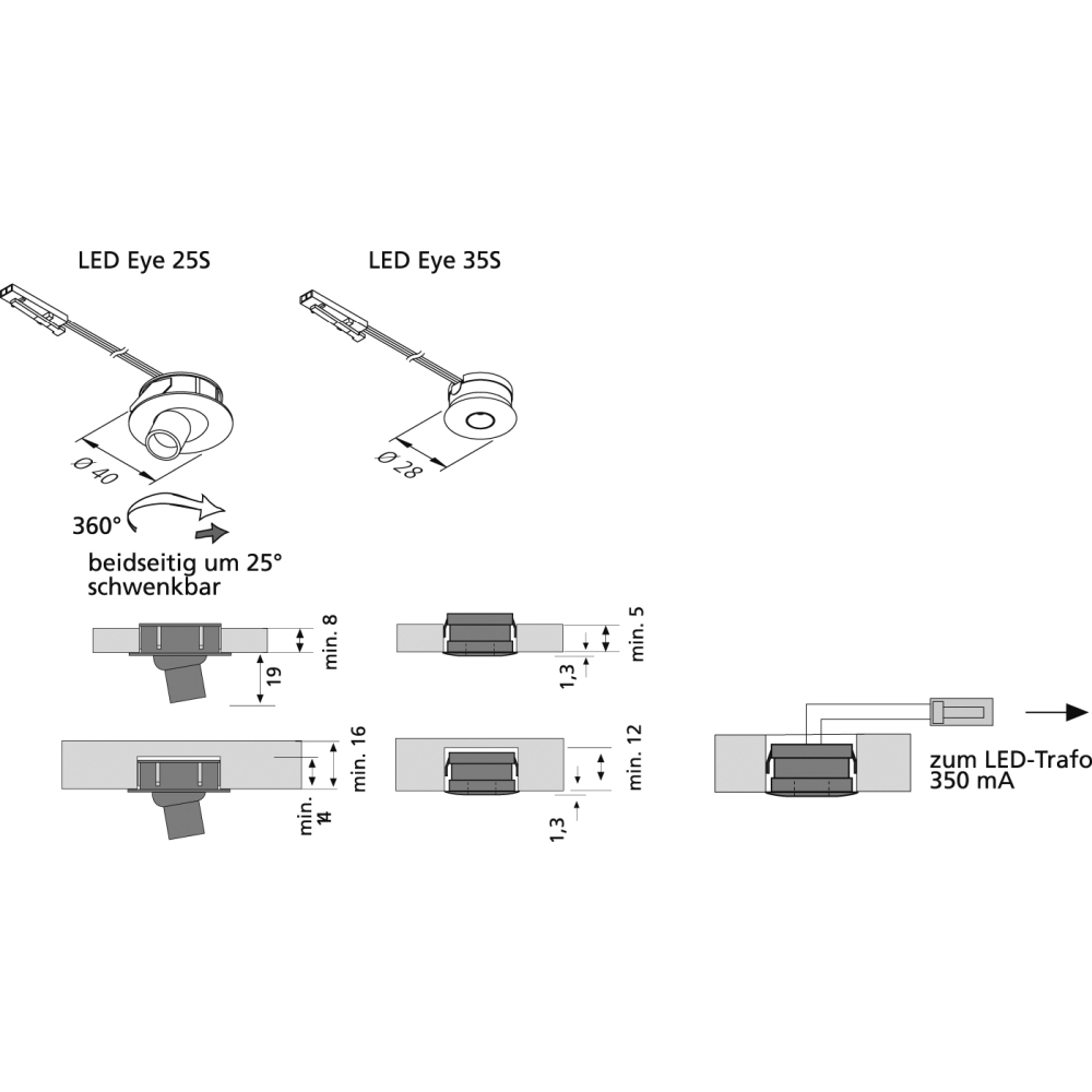 The LED Small Recessed Spotlight LED EYE 25S is a versatile lighting solution for objects. It is rotatable and swivelable, allowing for flexible light alignment. With an operating voltage of 350mA, it is energy-efficient and saves electricity.