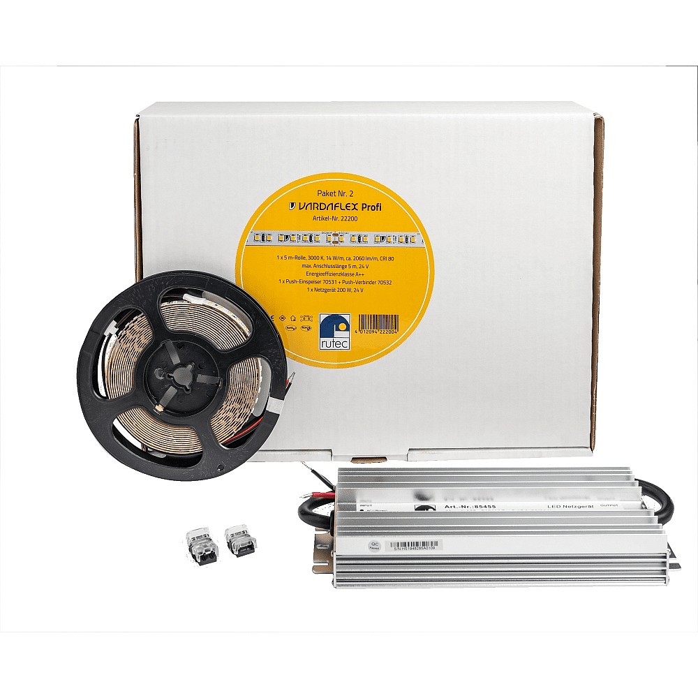 The LED Strip VARDAflex PAKET 2 PROFI from Rutec offers a power of 70W and a light output of 9750lm. With an energy efficiency class of E and a warm white light color, this LED strip is ideal for indoor use. With a light output of 139.2lm/W, this strip consumes only 70kWh per 1,000 hours.