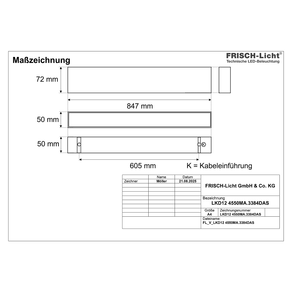 The LED light channel single luminaire from FRISCH-Licht® impresses with its high luminous efficacy of up to 132 lumens per watt and a luminous flux of 3,300 lumens at only 25 watts power consumption. With a color temperature of 4000K, it provides neutral white light that ensures pleasant and natural illumination. The luminaire is equipped with durable LED technology that guarantees an average lifespan of up to 80,000 hours, significantly reducing maintenance costs.