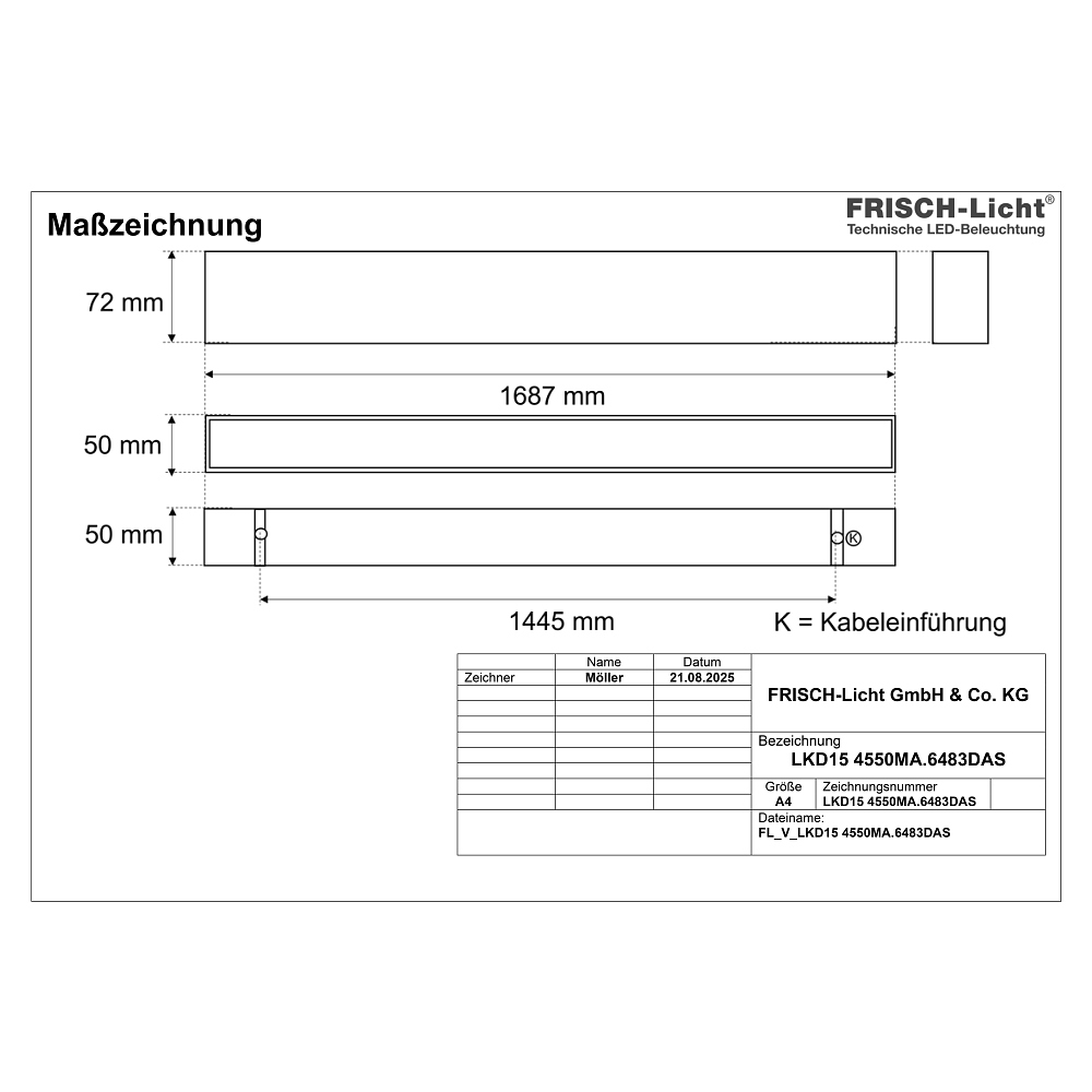 The FL-LKD154550MA.6483DAS is versatile in mounting: it can be installed directly on the ceiling or used as a pendant luminaire with optional cable suspension. A separate bracket is available for wall mounting. Thanks to the integrated DALI2 interface, the luminaire is dimmable and can be easily integrated into digital building automation systems. This allows the lighting to be individually adapted to different needs, saving energy and increasing comfort.