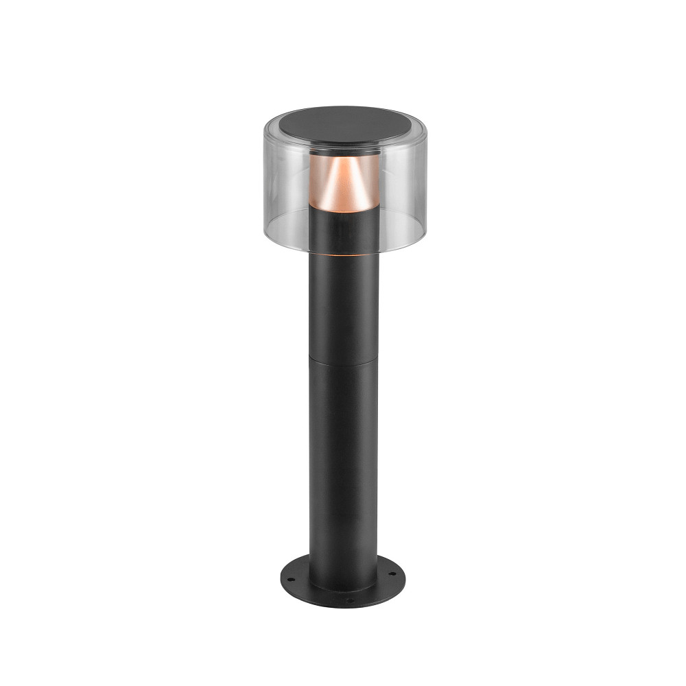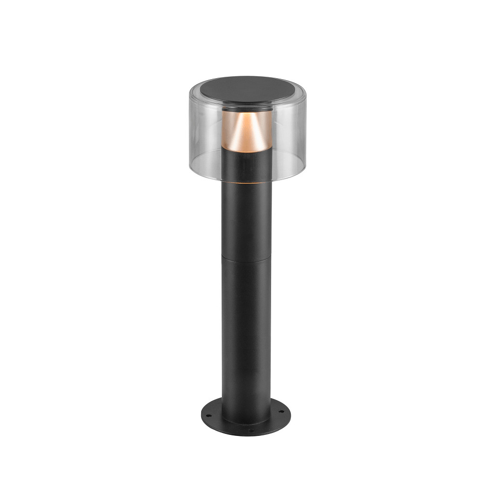 The outdoor LED floor lamp TAHA II 45 impresses with its modern, purist-cylindrical retro design and provides stylish accents. The housing is made of robust, black painted aluminum, combined with a shade in smoked glass look, which gives the lamp a noble and special appearance. With a height of 45 cm and a slim base diameter of 12 cm, the floor lamp blends harmoniously into various environments while remaining discreet and elegant.